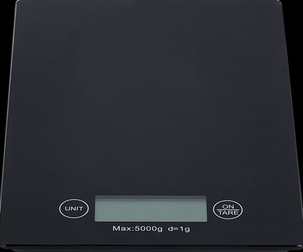 Digital køkkenvægt i sort glas, velegnet til præcis opmåling i madlavning og bagning. Med en kapacitet på op til 5 kg og en målenøjagtighed på 1 gram, er vægten egnet til både små og større mængder ingredienser.Vægten understøtter flere måleenheder – gram, kilogram, pund og ounce – hvilket gør den fleksibel til forskellige opskrifter. Tara-funktionen gør det muligt at veje flere ingredienser i samme skål, uden at skulle tømme imellem. Den har indikator for lav batteristyrke og overbelastning, samt automatisk sluk, der sparer batteri.Vægten drives af 2 x AAA batterier (medfølger ikke) og betjenes via to knapper til henholdsvis enhedsskift og tara. Den glatte glasoverflade er nem at rengøre og giver vægten et stilrent udtryk.Mål: Højde: 1,5 cm, Bredde: 14,5 cm, Længde: 20 cmMateriale: GlasFarve: Sort
