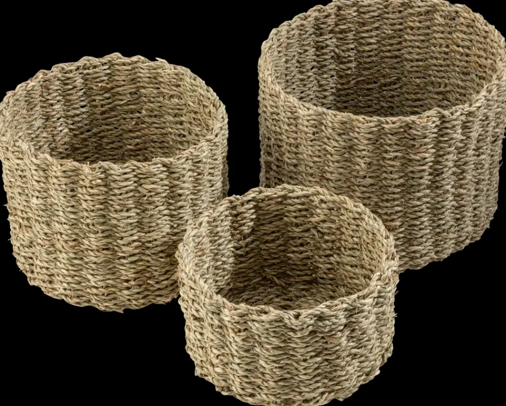 Sæt med tre opbevaringskurve fremstillet af naturligt søgræs der kombinerer funktionalitet med et stilrent udseende. De er velegnede til organisering af mindre genstande som nøgler, smykker, kosmetik eller kontorartikler og den flettede struktur giver et rustikt og naturligt look.Sættet indeholder tre kurve i forskellige størrelser: Lille kurv: H. 9,5 x Ø17 cm.Mellemstor kurv: H. 14 x Ø20 cm. Stor kurv: H. 15 x Ø23 cm.