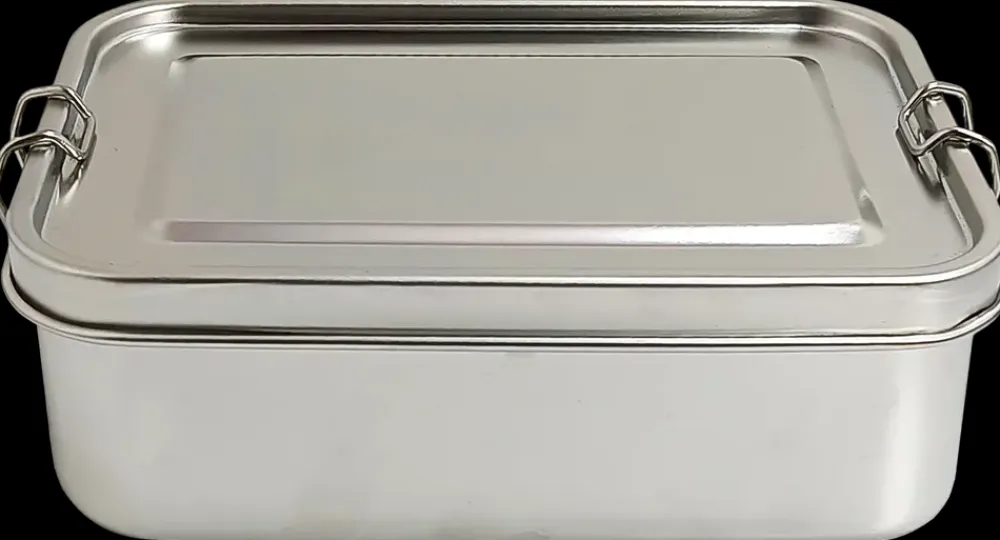 Praktisk madkasse i rustfrit stål med god plads til en større frokost.Lukkes med to klips, der holder låget sikkert på plads.Silikonepakning i låget sikrer tæt lukning og forhindrer lækage, så den egner sig til salater, risretter og andre måltider.Mål: H. 6,5 x B. 14 x L. 19 cm.Tåler opvaskemaskine.