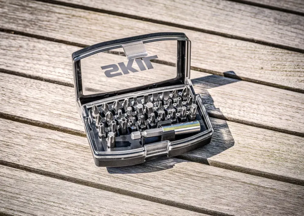 Kompakt 32-delt skruebitsæt fra SKIL med de mest anvendte typer bits samlet i én praktisk æske. Sættet indeholder Philips-, Pozidriv-, flad-, Torx- og sekskantbits i flere størrelser, så du er dækket til de fleste skrueopgaver i hjemmet og værkstedet. Den magnetiske bitholder gør det hurtigt og nemt at skifte bits under arbejdet, mens det gennemsigtige låg giver godt overblik over indholdet.Bitsene er fremstillet i robust stål for lang levetid, og æsken er kompakt nok til at opbevares i værktøjskassen eller tages med på farten.Indhold:Philips 1x PH1 2x PH2 1x PH3Pozidriv 1x PZ1 2x PZ2 1x PZ3Flad 1x SL3 1x SL4 1x SL5 1x SL6Torx 1x T10 1x T15 2x T20 1x T25 1x T27 1x T30 1x T40Torx TR T10 1x T15 1x T20 1x T25 1x T27 1x T30 1x T401x Magnetisk bitholder
