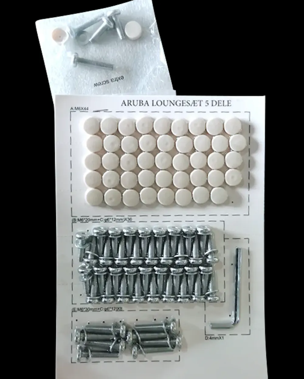 Skruesæt til 41914 ARUBA loungesætIndeholder:2 typer skruer1 type skiver1 type beklædningsknop1 unbrakonøgle
