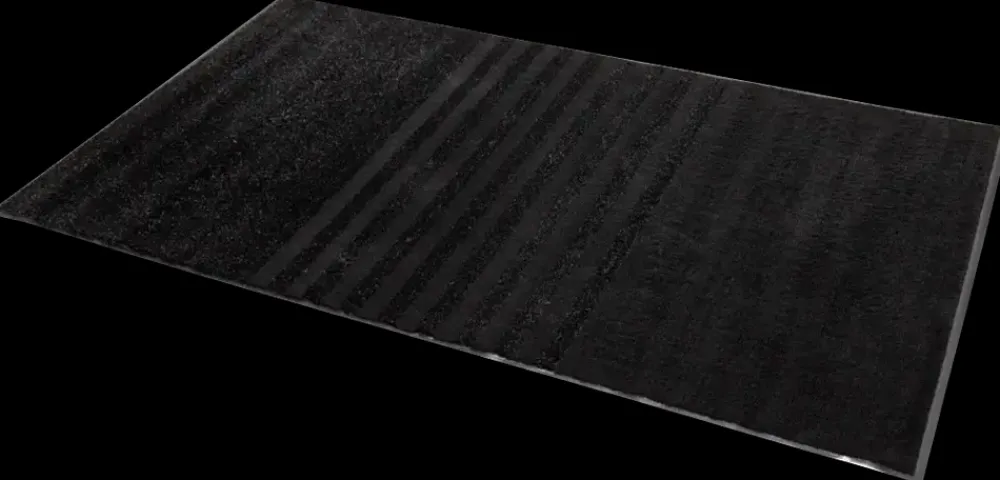 Funktionel dørmåtte med tre integrerede zoner, der hver har en specifik rengøringsfunktion:Grov zone: Fjerner større partikler som græs, jord og småsten.Mellem-grov zone: Har afstand mellem fibrene, så skosålernes fordybninger kan renses effektivt.Blød zone: Optager fugt og vand, så snavs og væde ikke føres med indenfor.Måtten måler 90 x 150 cm og er fremstillet i polyester med skridsikker PVC-bagside. Den mørke farve (sort/grå) gør den velegnet til områder med meget færden, hvor der stilles krav til funktion og rengøring.