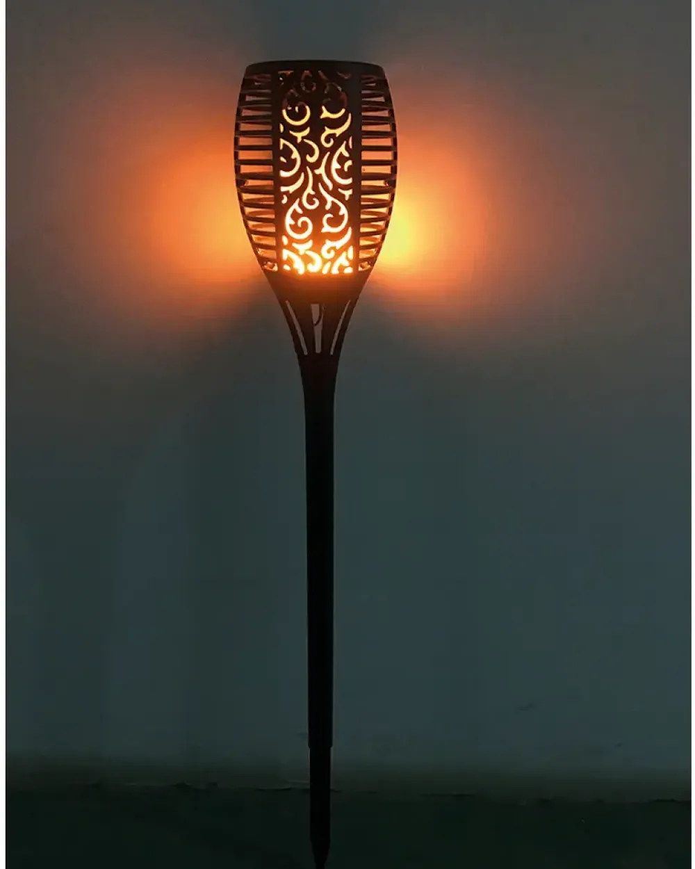 Fakkel solcellelampe på spyd med LED-lys, der flakker som en rigtig flamme. Med automatisk identificering af dag og nat. Lyser kun når det er mørkt. Strømforsyning: Genopladeligt Ni-MH batteri.ON/OFF-knap