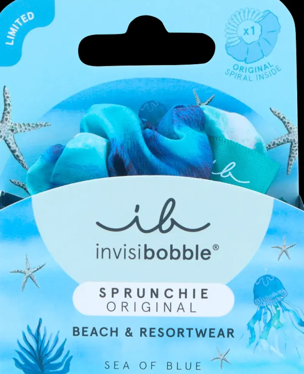 Sprunchie er en retro hårelastik med spiralform.Sprunchien sidder godt fast uden at efterlade mærker i håret.invisibobble-sprunchien er designet til at være mindre skadende for håret og mere behagelig end almindelige elastikker.Denne sprunchie kommer med et mønster i blå nuancer, der leder tankerne hen på blåt, klart vand på stranden under en skyfri himmel.