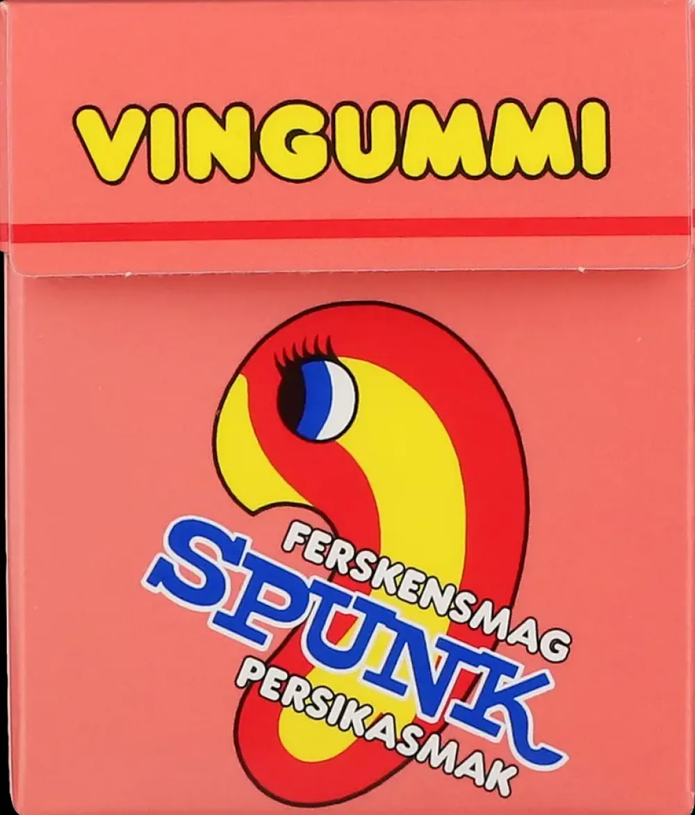 SPUNK Vingummi Fersken er små, farverige vingummier med tydelig ferskensmag. Den klassiske lyserøde æske med det karakteristiske SPUNK-logo gør produktet let genkendeligt og oplagt som snack til både børn og voksne.Vingummierne indeholder glukose-fruktosesirup, sukker og gelatine, kombineret med syre (æblesyre) og naturlig aroma for at opnå den frugtige smag. Farvestofferne er baseret på blandede carotener og carmin. Produktet er overfladebehandlet med carnaubavoks og indeholder vegetabilske olier (kokos og raps). Æsken indeholder 23 gram.Næringsindhold pr. 100 g:Energi: 1497 kJ / 352 kcalFedt: 0,5 g (heraf mættede fedtsyrer 0,1 g)Kulhydrat: 82 g (heraf sukkerarter 63 g)Protein: 5,3 gSalt: 0,01 g