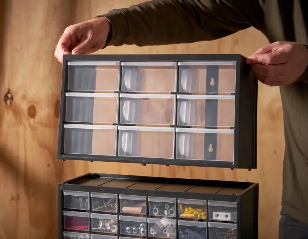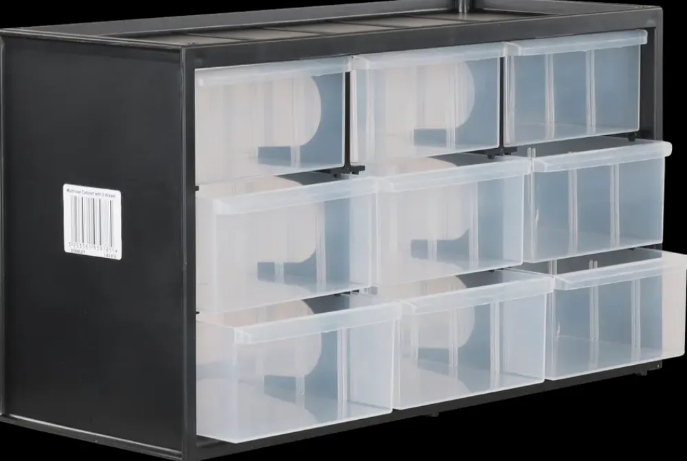 Magasin til smådele med 9 transparente skuffer. Robust og modstandsdygtigt over for brud plastramme. Slagfaste pladser i transparent polypropylen til god synlighed af indholdet. Magasinerne kan stikkes ind i hinanden – til en fleksibel, modulopbygget opbevaringssystem.Egnet til vægmontering.