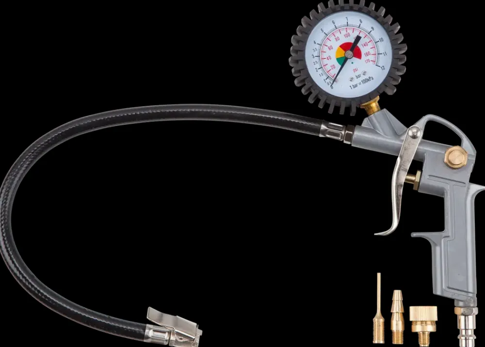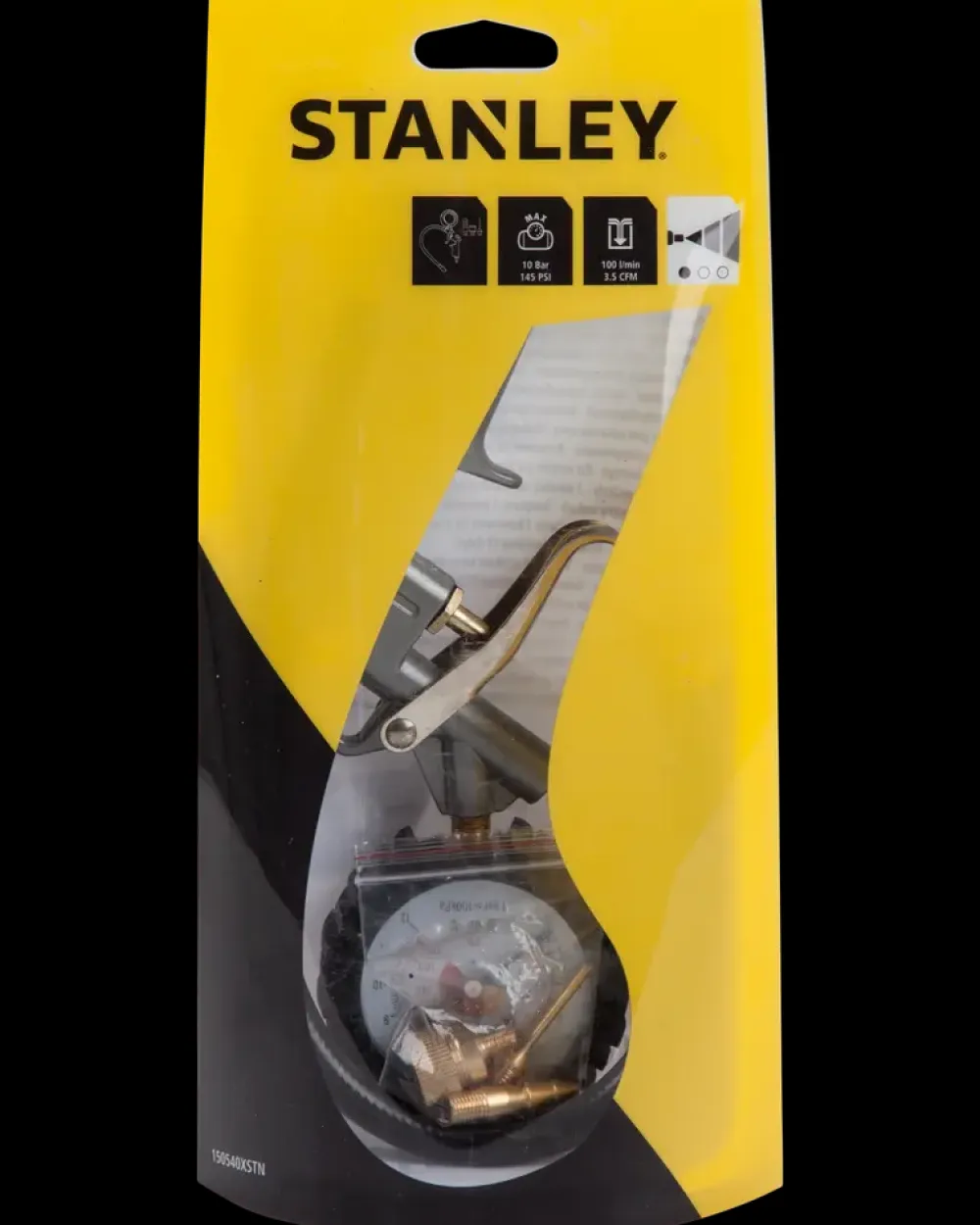 Trykluft pumpepistolsæt med 4 dele fra Stanley.Sættet består af:1 stk. trykluft pumpepistol med manometer.3 stk. pumpenipler.