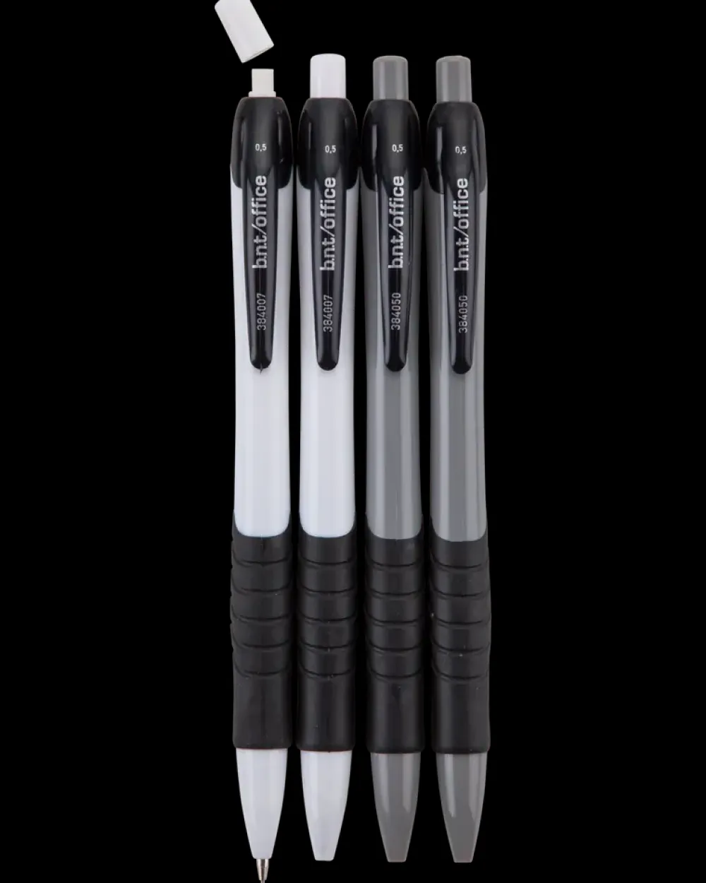 bnt/office mekaniske stiftblyanter 0,5mm.4 stk.Blyanterne har et behageligt gummigreb og giver en behagelig skriveoplevelse. 4 pakke grå /hvideFarvet krop med clips og viskelæder.RoHS og EN-71 certificeret