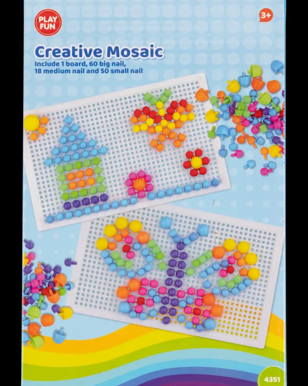 Et stiftmosaiksæt til at lave enkle mønstre og figurer med farvede plaststifter. Stifterne sættes i hullerne på pladen, hvor de står fast og kan flyttes efter behov. Sættet giver mulighed for leg, farvelære og træning af finmotorik.Pladen har tæt hulmønster, som gør det muligt at variere motiverne. Stifterne er afrundede og lette at holde om, hvilket gør dem egnede til børn, der skal øve håndtering af små dele. Materialet er slidstærkt og kan bruges igen og igen.Mål: H. 14 x B. 22 cmMateriale: PP plastAntal dele: 128