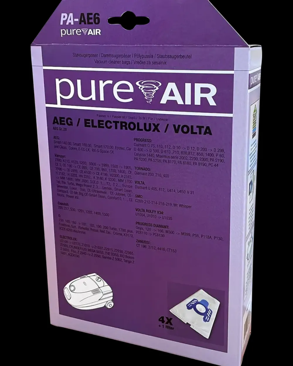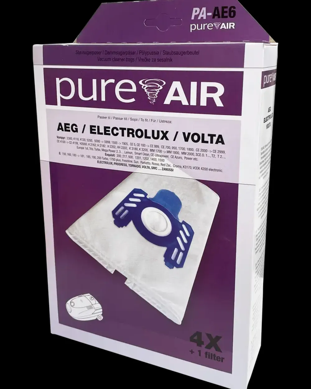Kompatible støvsugerposer i slidstærk mikrofiber til AEG, Electrolux og Volta støvsugere.Den flerlagede opbygning filtrerer effektivt støv, pollen og små partikler og bevarer en stabil sugeevne gennem hele posens levetid. Den forstærkede plastflange sikrer præcis pasform og tæt lukning, så støvet holdes inde i posen.Medfølgende motorfilter beskytter støvsugermotoren og bidrager til renere udblæsningsluft.Pakken indeholder 4 støvsugerposer og 1 motorfilter.
