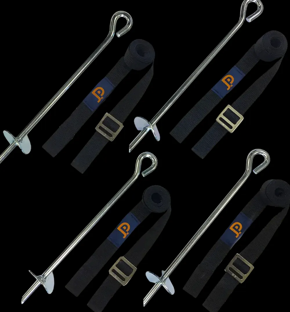 Stormankre med tilhørende stropper. Anvendes bl.a. til stormsikring af trampoliner.