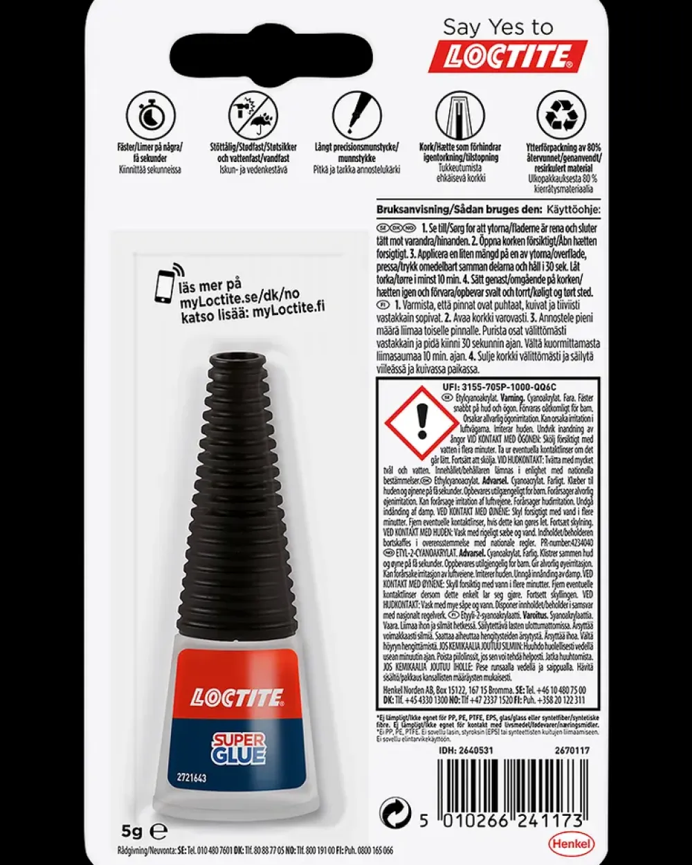 Velegnet til porcelæn, træ, læder, metal, gummi, pap og de fleste plastmaterialer. Type: Superlim.