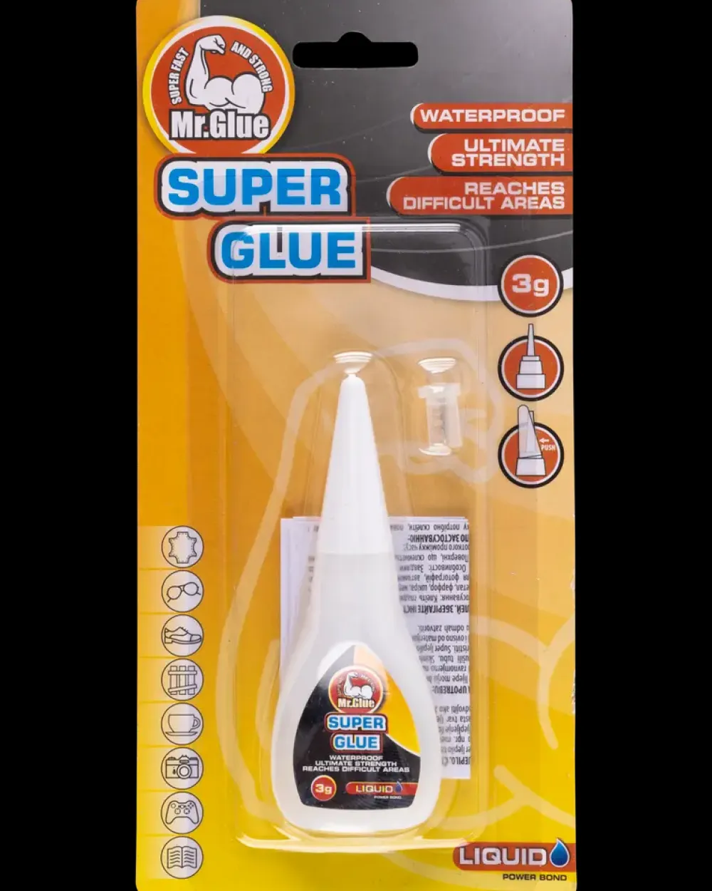 Utrolig stærk lim, der kan bruges til f.eks. metal, plast, papir, læder, glas, gummi, træ og porcelæn.Limen er vandtæt.
