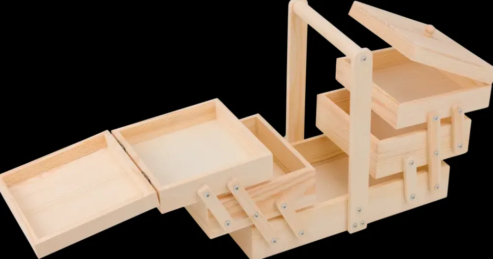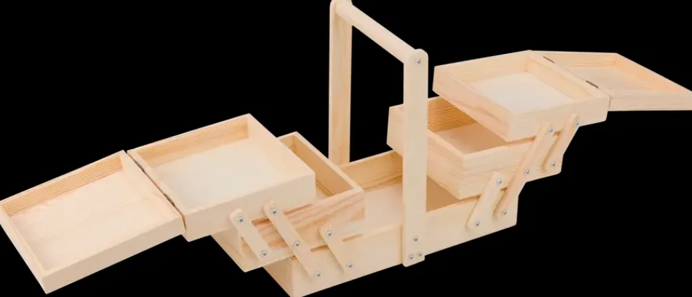 Smart syæske til opbevaring af strikke-, hækle- og sytilbehør. Masser af rum til at organisere. Kassen er fremstillet i fyrretræ og er ganske let, så den er nem at tage med på farten.Mål, fuldt udslået: H. 25 x B. 14,5 x L. 82 cm.Materiale: Fyrretræ.