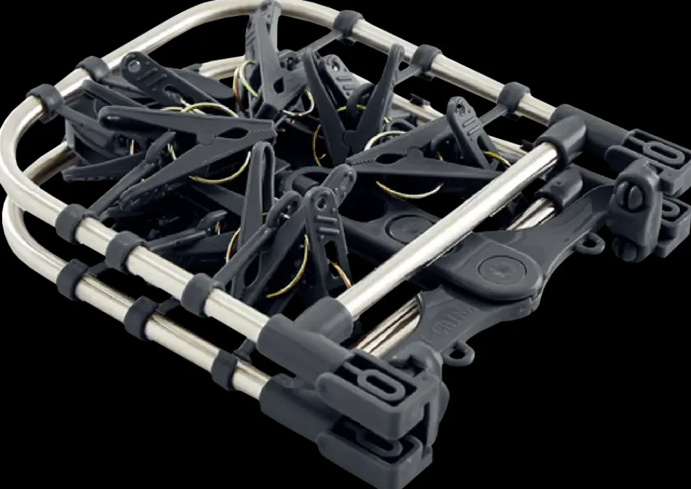 Tørrestativ til ophæng i rustfrit stål med 14 klemmer. Mål udslået: H. 30 x B. 18 x L. 42 cm.Mål, sammenfoldet: H. 3,5 x B. 18 x L. 21 cm.