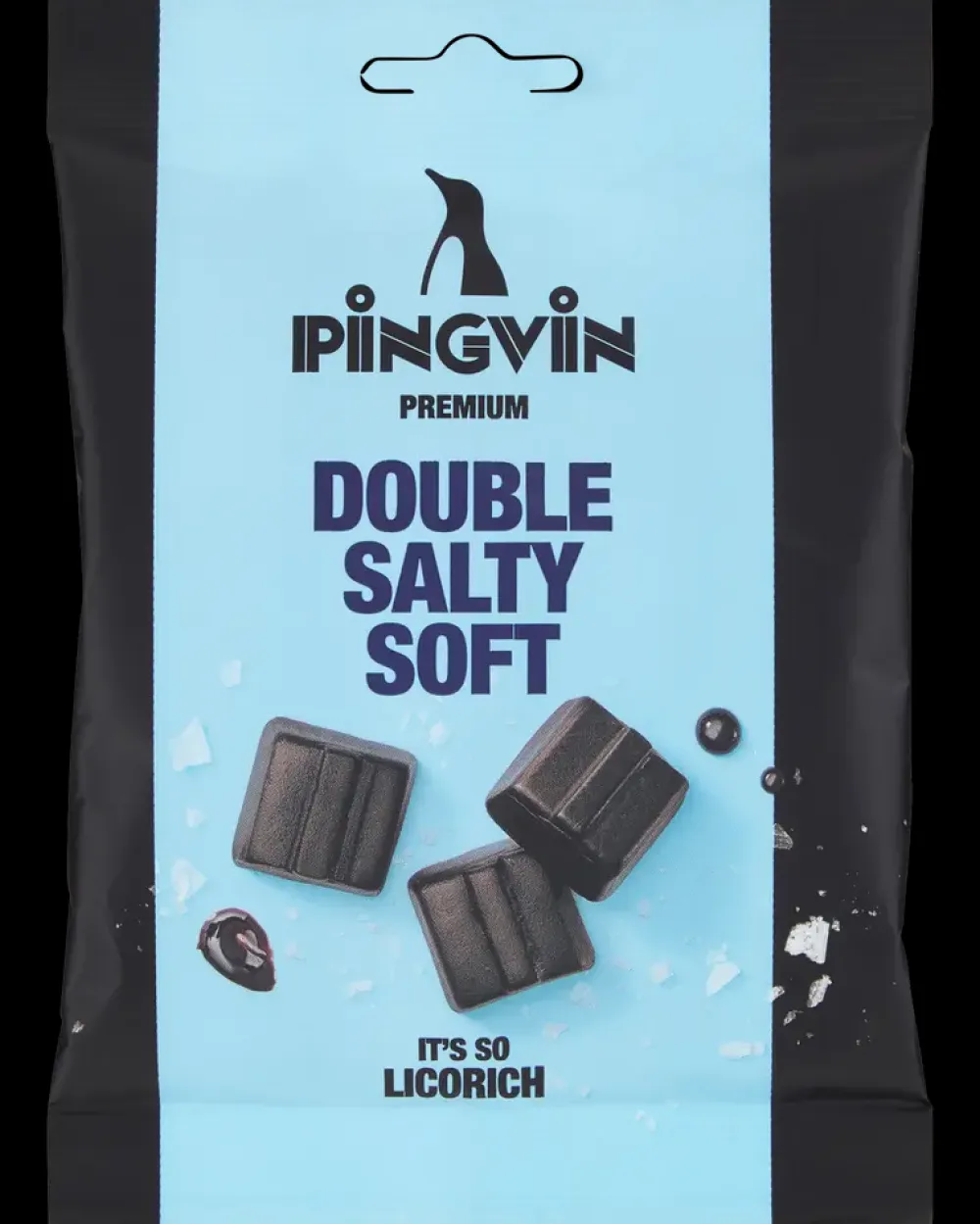 PINGVIN Double Salty Soft er bløde lakridsstykker med ekstra salt smag, der henvender sig til forbrugere med hang til intens lakrids. Produktet kommer i en 90 grams pose og indgår i Pingvin Premium-serien, som fokuserer på høj smagsintensitet og kvalitet.Lakridsen er fremstillet med 5 % ammoniumklorid og 3 % rålakrids, hvilket giver en kraftig, dobbelt salt smagsprofil. Konsistensen er blød og let at tygge, mens udformningen er firkantet og glat med en mørk overflade. Ingredienserne omfatter desuden sukker, glukosesirup og naturlig aroma. Produktet er overfladebehandlet med carnaubavoks og tilsat vegetabilske olier.Næringsindhold pr. 100 g:Energi: 1427 kJ / 336 kcalFedt: 0,5 g (heraf mættede fedtsyrer 0,1 g)Kulhydrat: 78 g (heraf sukkerarter 47 g)Protein: 5,2 gSalt: 0,22 g