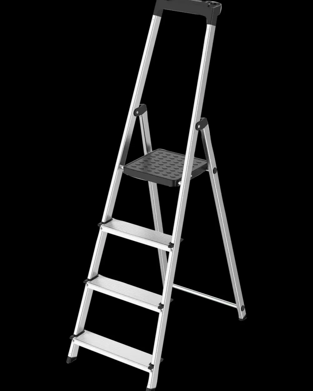 Letvægtstrappestige med 4 skridsikre trin, der giver stabilitet og sikkerhed under brug. Velegnet til både husholdning og lettere gør-det-selv-opgaver, hvor ekstra rækkevidde er nødvendig. Trappestigen er fremstillet i aluminium, hvilket gør den let at håndtere og nem at flytte rundt på.Stigen kan foldes sammen til en kompakt størrelse, hvilket gør den pladsbesparende og let at opbevare i skab, kælder eller værksted. Øverste trin er udstyret med en rillet, skridsikker overflade og håndtaget i toppen giver støtte og balance under brug. Maksimal belastning er 150 kg og den er godkendt efter EN131-standarden for stiger.Udfoldede mål: H. 137,9 x B. 42 x D. 74 cmSammenfoldede mål: H. 147,8 x B. 42 x D. 11 cmPlatformshøjde: 75,9 cmFarve: Sølvfarvet med sort trin og håndtagMateriale: Aluminium og plast