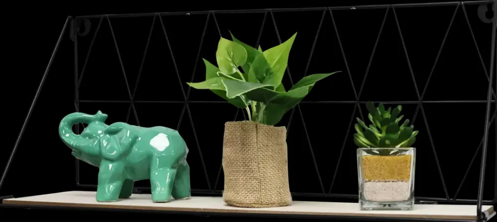 Elegant væghylde i sort metal med træhylde. Hylden måler 48 cm i bredde, 13 cm i dybde og 20 cm i højde, ideel til opbevaring eller udstilling af dine yndlingsgenstande.Skruer og rawlplugs medfølger.