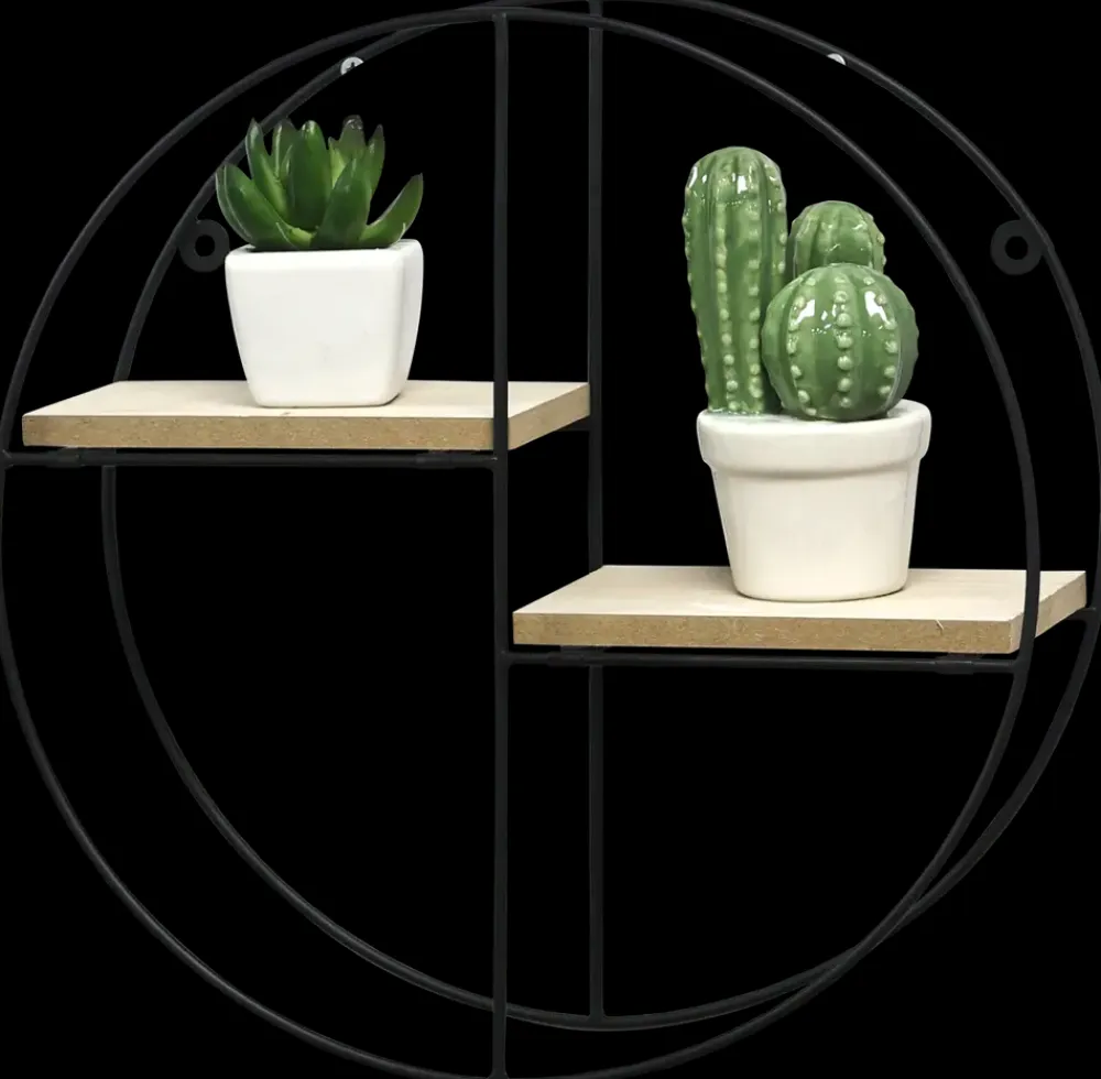 Enkel og funktionel vægreol i rund design med en diameter på 30 cm. Reolen har 2 træhylder med en dybde på 10 cm.