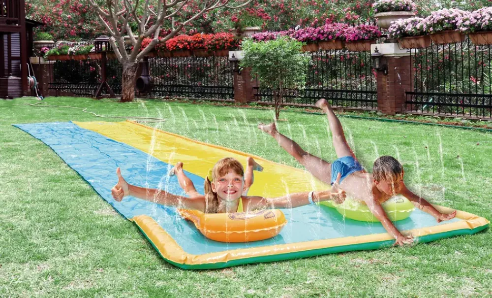 Vandglidebane der nemt tilsluttes en almindelig haveslange – så er man klar til masser af timers sjov vandleg i haven.Den dobbelte vandglidebane giver rig mulighed for at glide om kap!Glidebanen har oppusteligt hovedgærde for øget sikkerhed.Der medfølger 2 oppustelige surf-ridere, som gør turen hen ad glidebanen endnu sjovere.