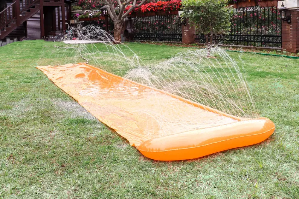 Vandglidebane der nemt tilsluttes en almindelig haveslange – så er man klar til masser af timers sjov vandleg i haven.