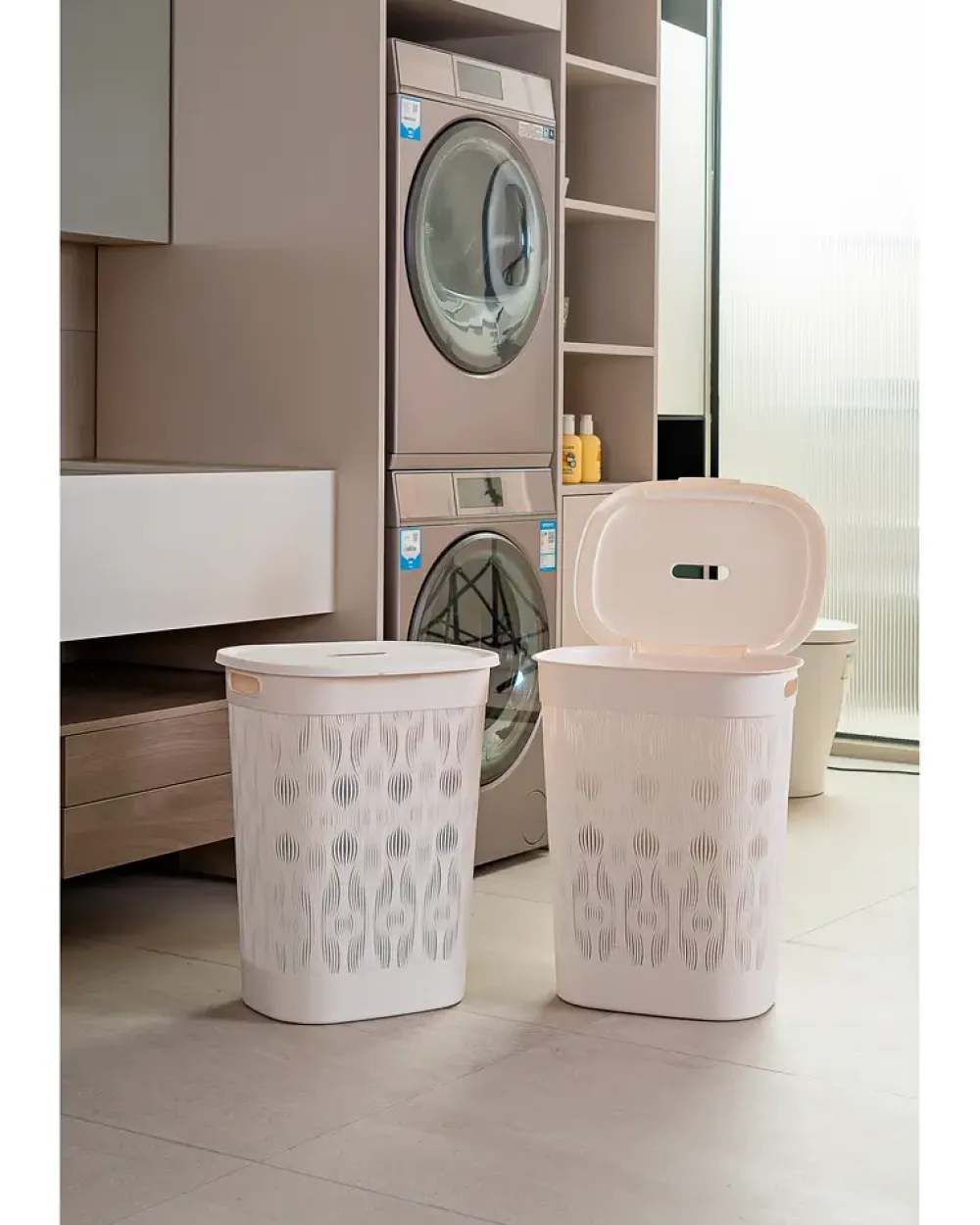 Oval vasketøjskurv med låg i slidstærkt PP-plast. Designet med bølget mønster i siderne, som giver ventilation og et neutralt udtryk.Kurven har låg med integreret greb og håndtag i siderne, så den er nem at flytte. Den strukturerede overflade giver et dekorativt præg og forbedret greb. God kapacitet til daglig brug.Mål: H. 57 x B. 44 x D. 35 cmMateriale: PP-plast