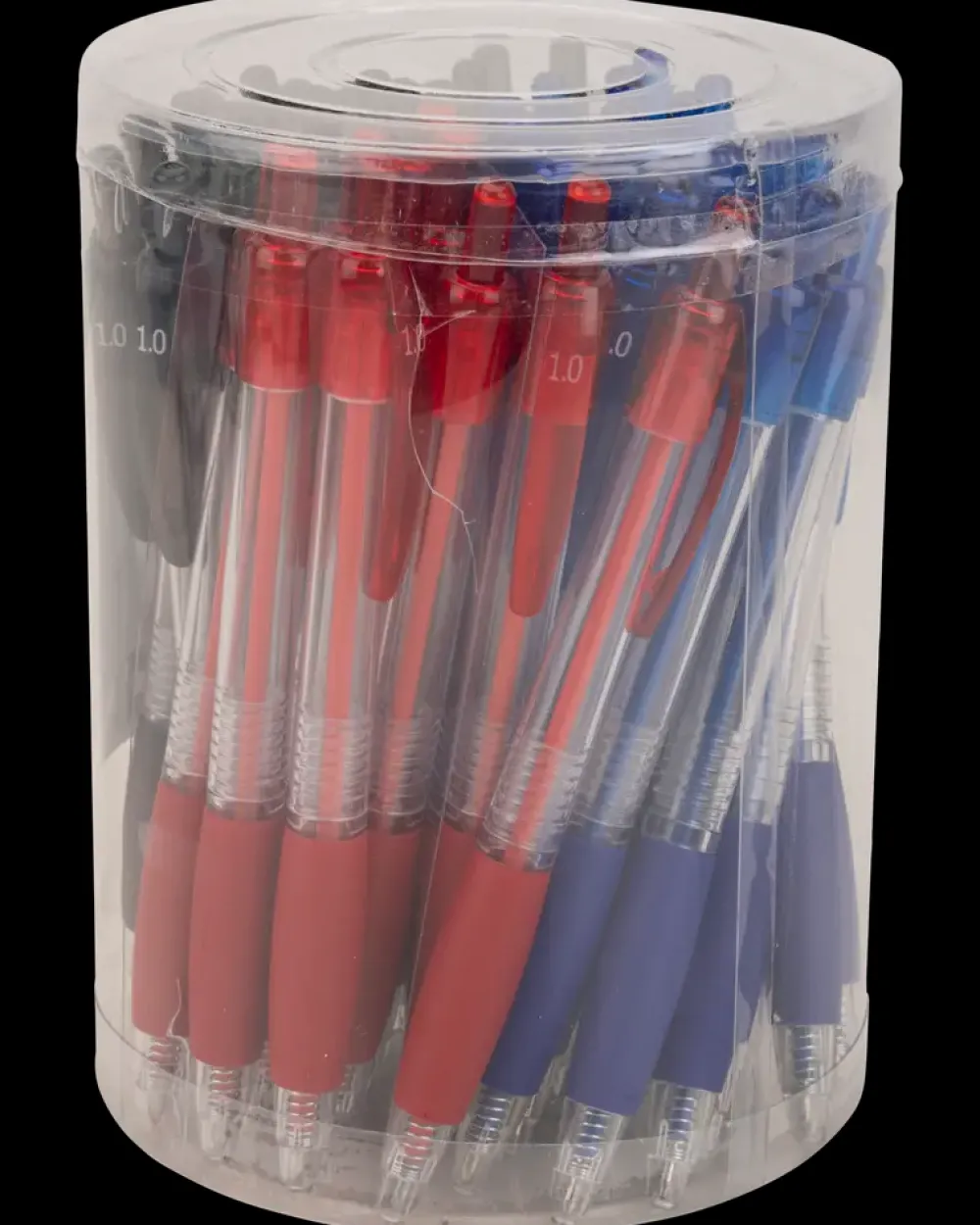 Kuglepenne med 1,0 mm spids i pakke med 50 stk. Egnet til daglig brug i skole, på kontor og i hjemmet. Sættet indeholder tre standardfarver til almindelige skriveopgaver og notater.Pakken rummer 20 sorte, 20 blå og 10 røde penne. Den mellemtykke spids giver en jævn og tydelig skrift. Plastkrop i PP.Tekniske detaljer:Spids: 1,0 mmAntal: 50 stk.Farver: sort, blå, rødMateriale: PP