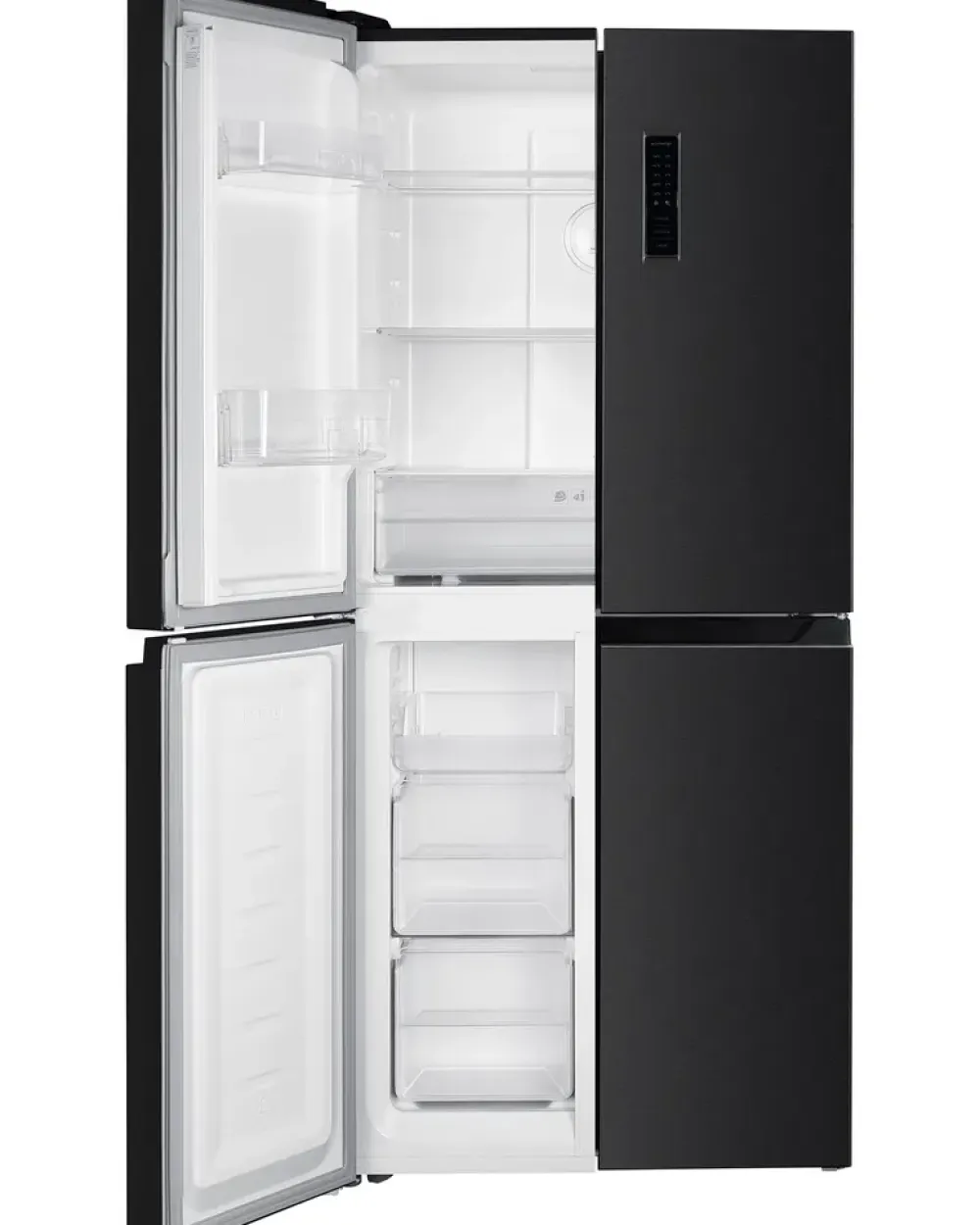Stilrent køle-fryseskab med 4 låger og en samlet kapacitet på 362 liter. Skabet er udstyret med Total No Frost-system, der sikrer en jævn fordeling af kold luft via multi-airflow-teknologi, hvilket forhindrer isdannelse og holder maden frisk i længere tid.Det eksterne digitale display giver nem adgang til temperaturindstillinger og funktioner som ECO-tilstand og Super Freeze. Den fleksible crisper-box har en variabel temperaturzone mellem 2-8°C, hvilket giver optimal opbevaring af forskellige madvarer.For ekstra sikkerhed er der en dør-alarm, der giver en lydadvarsel, hvis dørene står åbne for længe. Kapacitet: 362 L.Kølerkapacitet: 237 L.Fryserkapacitet: 125 L.Total No Frost-system for jævn temperatur.Digitalt display med ECO- og Super Freeze-tilstand.Fleksibel crisper-box (2-8°C).Dør-alarm advarer ved åbne døre.Aftagelige hylder og skuffer for nem rengøring.