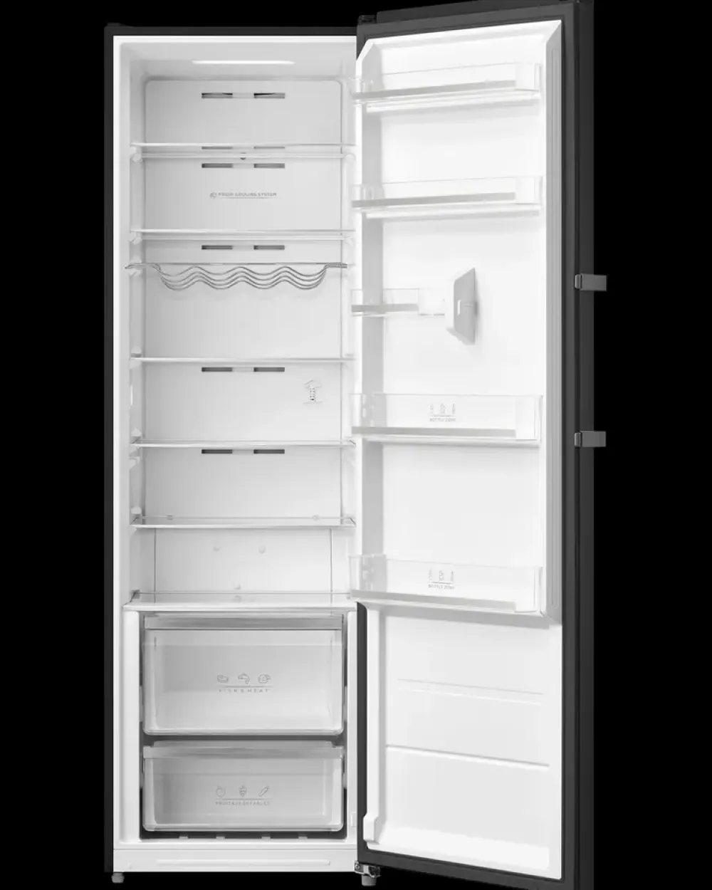 Køleskab til den store familie.2 skuffer til opbevaring af grøntsager og frugter.Vinhylde / flaskeholder til 4 flasker.Hurtig og nem at rengøre. Skuffer og hylder er alle aftagelige.Automatisk afrimning.Elektronisk Touch kontrol.LED-lys i skabet.Køleskabet er beregnet til brug ved en omgivelsestemperatur på mellem 10°C og 43°C.3 års garanti.