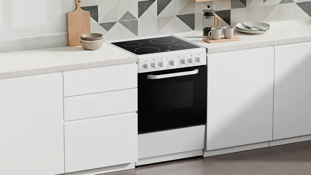 Dette glaskeramiske komfur fra WASCO har en ovnkapacitet på 65 liter og tilbyder 9 funktioner, herunder konventionel varme, varmluft, grill og optøning. Kogepladen har fire zoner: to på 1200 watt og to på 1800 watt, så du nemt kan tilberede flere retter ad gangen.Komfuret betjenes med mekaniske drejeknapper og har energiklasse A. Ovnlågen er udstyret med to-lags glas for øget sikkerhed. Ovnrummet er formstøbt uden side-ribber og har 5 hyldeniveauer. Der medfølger dyb og lav bradepande samt ovnrist. Komfuret har justerbare fødder og udtræksskuffe.Apparatet leveres uden strømledning, og det skal tilsluttes af en autoriseret elektriker.3 års garanti.Tilbehør1 dyb bradepande1 lav bradepande1 ovnristSpecifikationerOvnkapacitet: 65 literAntal ovnfunktioner: 9 (inkl. varmluft, grill og optøning)Kogeplade: Glaskeramisk, 6000 watt2 zoner á 1200 watt2 zoner á 1800 wattEnergiklasse: ABetjening: Mekaniske drejeknapperOvnlåge: 2-lags glasOvnrumsdesign: Uden side-ribberHyldeniveauer: 5Underskuffe: Udtræksskuffe i bundenFødder: JusterbareMål (BxDxH): 60 x 60 x 90 cm