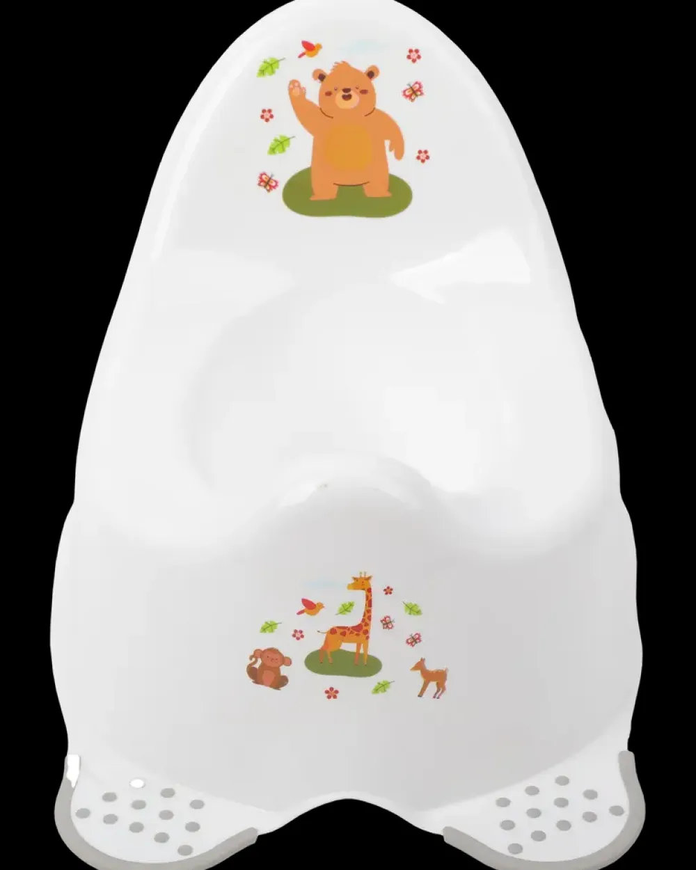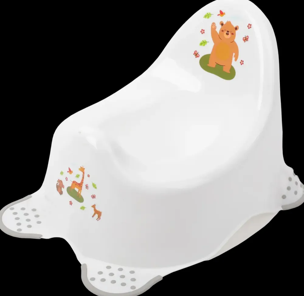 Børnepotte i hvid plast med farverigt print på ryg og front. Udformet med fokus på komfort og stabilitet – velegnet til små børn under pottetræning. Den høje ryg og afrundede form giver god siddekomfort, mens gummikant under fødderne forhindrer, at potten glider. Den glatte overflade er nem at rengøre, og den lave vægt gør den let at flytte.