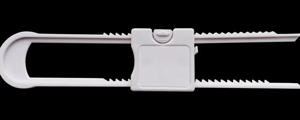 Skabslås designet til at forhindre små børn i at åbne skabe. Denne lås monteres nemt omkring håndtagene på to tilstødende skabslåger. Med en enkel låsemekanisme kan voksne hurtigt få adgang til skabet, mens det forbliver utilgængeligt for børn. Skabslåsen er fremstillet af robust ABS-materiale og måler 19,8 x 4 cm.