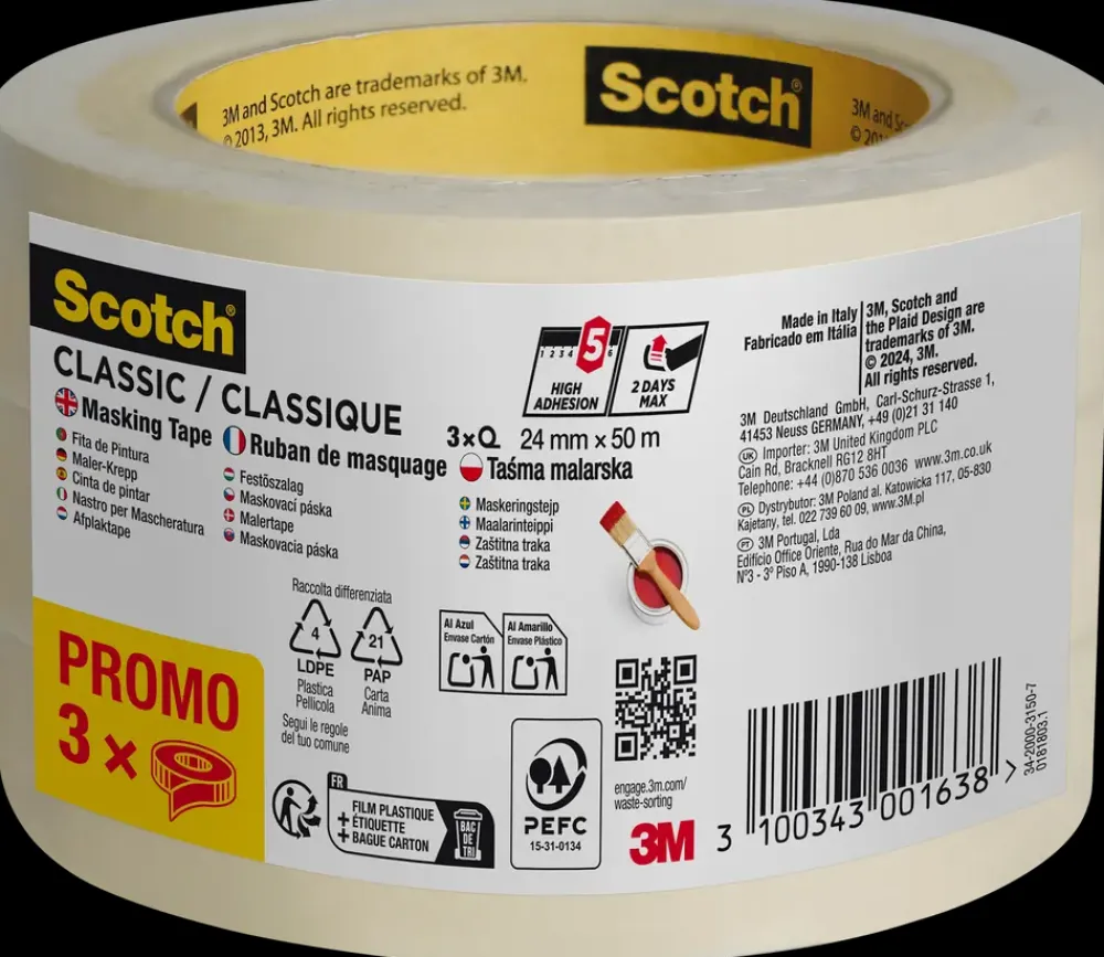 Scotch® Classic malertape er en klassisk afdækningstape til maler- og overfladearbejde, hvor der er behov for sikker afdækning under arbejdet og nem fjernelse bagefter uden klæberester. Tapen er beregnet til indendørs brug og kan sidde på overflader i op til 2 dage.Afdækningstapen anvendes på overflader som træ, metal og plast og giver en tydelig afgrænsning ved maling, lakering eller lettere montageopgaver. Den beige, papirbaserede malertape kan rives over i hånden, hvilket gør arbejdet mere effektivt uden brug af værktøj.Klæbeevnen er mellemstærk til høj og sikrer, at afdækningstapen bliver siddende stabilt under arbejdet. Malertapen følger overfladen jævnt og er let at tilpasse langs kanter, lister og samlinger.Tekniske detaljerBredde: 24 mmLængde: 3 x 50 mFarve: BeigeAnvendelse: Træ, metal og plastAnbefalet brugstid: Op til 2 dage indendørs