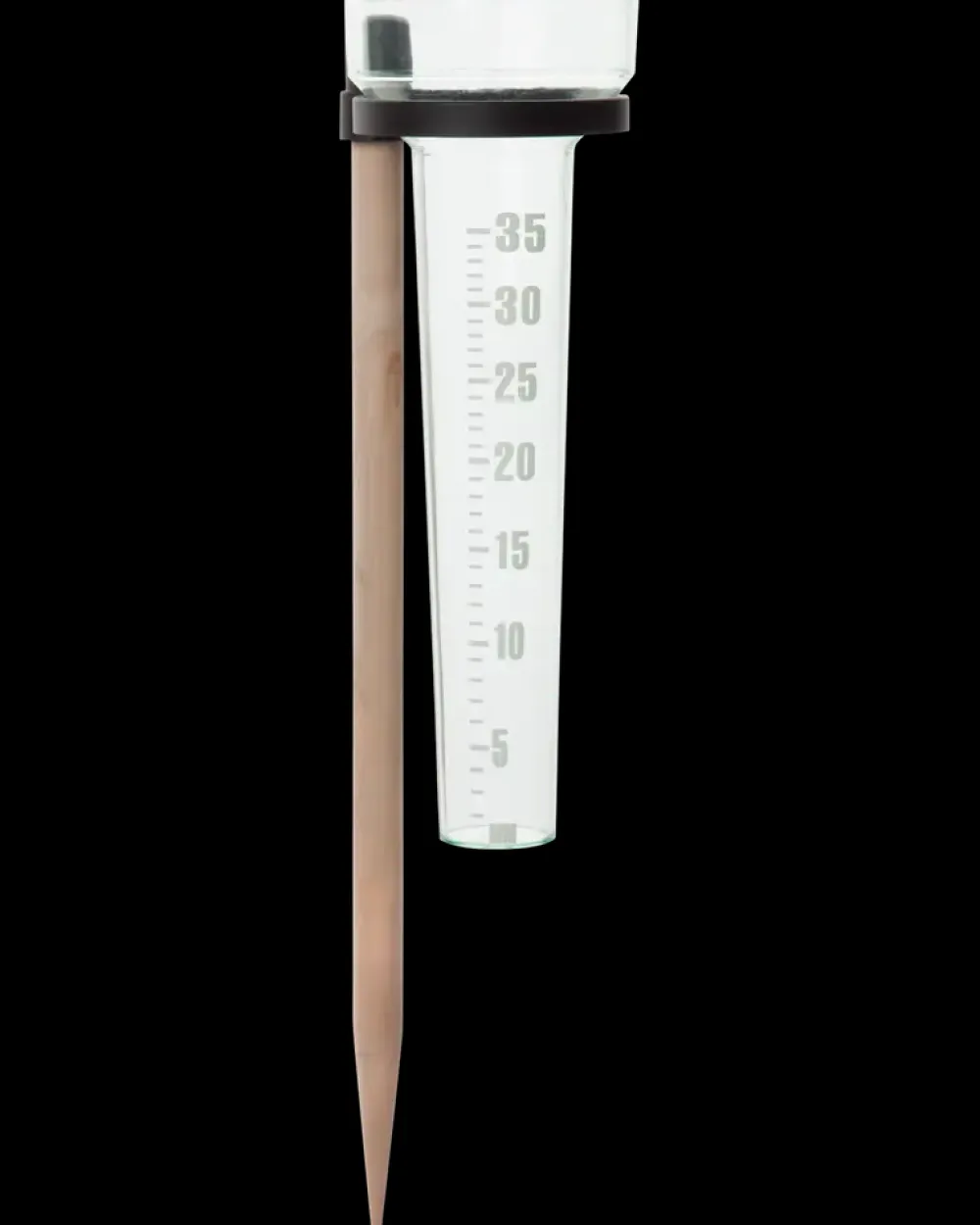 Klassisk regnmåler fra Adano med holder i træ. Stikkes direkte i jorden. Vandmængden aflæses på beholderen.