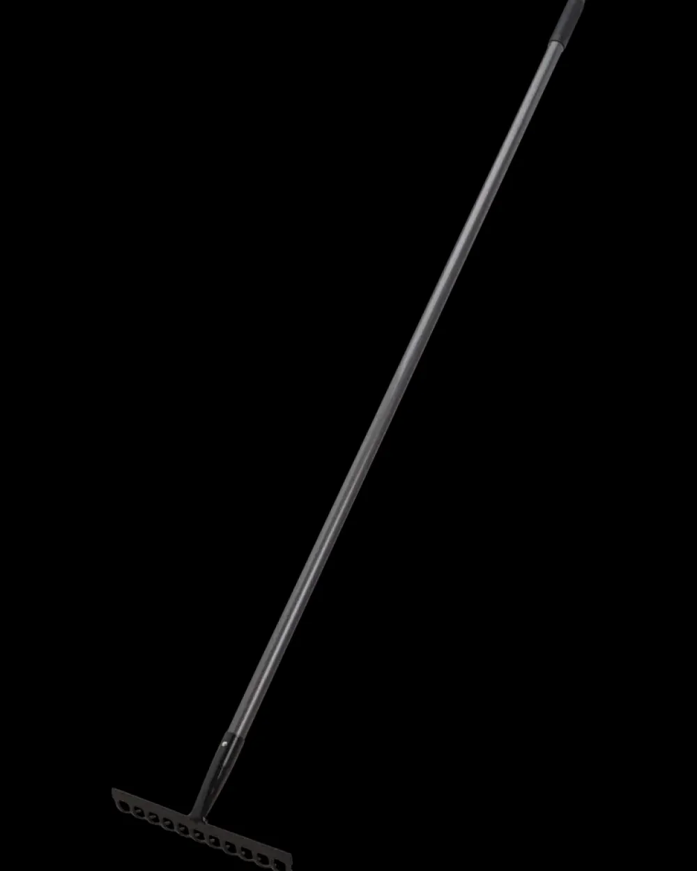 Rive fra Adano med skaft i fiberglas og gummigreb for enden af skaftet.12-tandsriven er god til tilberedning af såbede, havegange og store flader, der skal planeres, eksempelvis blomsterbede og plænejord. Det brede hoved giver hurtigere arbejdsgang på store arealer.