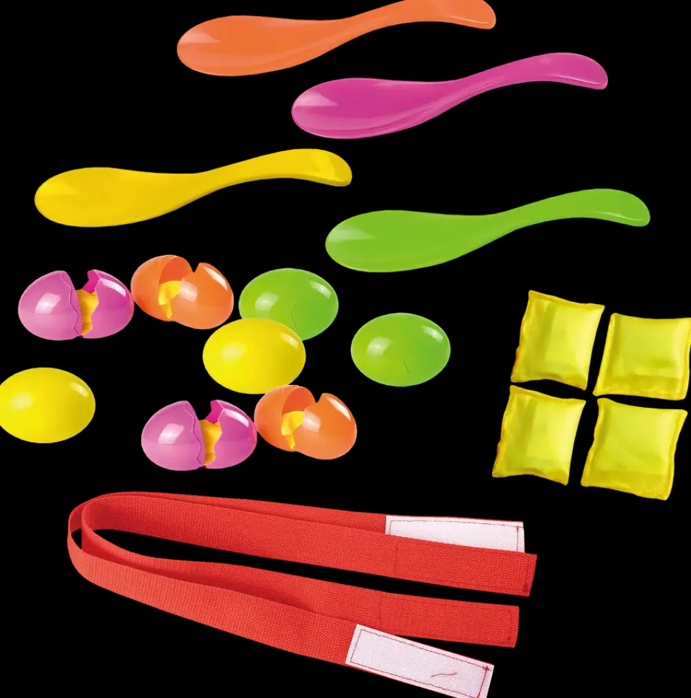 Til den aktive børnefødselsdag eller havefest. Pakken indeholder 4 skeer, 8 æg med små sandsække inden i samt 2 ankelbånd. Spillets gang: Der sættes hold af to og to sammen med ankelbånd. Herefter får hver spiller én ske og to æg. Det gælder om at komme først i mål med sine æg balancerende på skeen, der må kun løbes med ét æg på hver ske ad gangen. Find evt. selv på en bane der skal løbes, rundt om et træ, have stolen, måske rundt om huset. Husk nu at man må ikke tabe ægget, så har du tabt løbet.