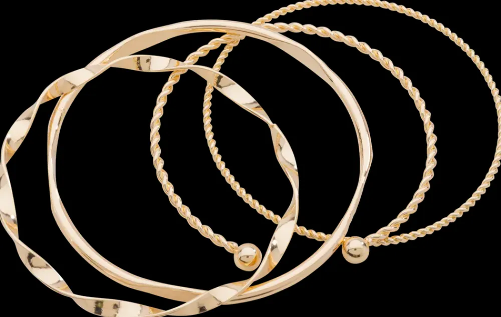 Sæt med 4 guldfarvede armbånd i forskellige designs, der kan bæres sammen eller hver for sig. Sættet inkluderer et snoet armbånd, to armbånd med let buede former og et smalt armbånd med små dekorative sten. Velegnede til både hverdagsbrug og festlige anledninger. Armbåndene er nikkelfri og skånsomme mod huden.De er ikke vandresistente og bør opbevares tørt for at bevare deres glans og holdbarhed.