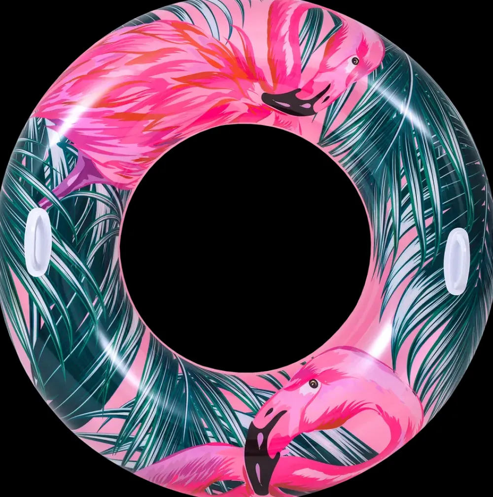 Ekstra store baderinge med en diameter på 115 cm og flotte tropemotiver.Baderingen har to solide håndtag, som gør den nemmere at navigere med, når man flyder rundt i f.eks. poolen.Reparationssæt medfølger.