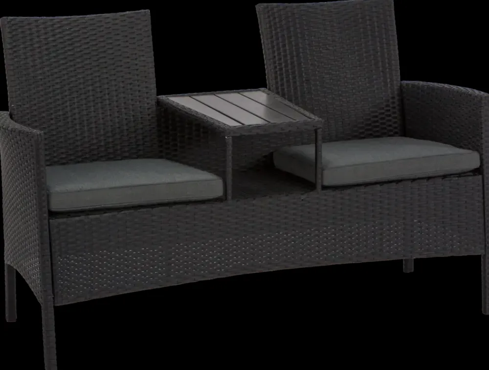 Denne dobbelte havestol er designet til to personer og kombinerer komfort med praktisk funktionalitet. Møblet er fremstillet i sort polyrattan flettet omkring et robust, pulverlakeret stålstel, hvilket giver både stabilitet og et moderne udtryk. Mellem de to sæder er der en fastmonteret afsats, som fungerer som et lille bord – ideelt til kaffekoppen, bogen eller andre småting.Tekniske specifikationer:Mål (LxDxH): 138 x 61 x 85 cmSædemål pr. sæde: 49 x 46,5 cmSædehøjde: 44 cmArmlænshøjde: 66 cmMaterialer: Pulverlakkeret stål, polyrattan og nonwood-lamellerInkl. hynderMaks. belastning pr. sæde: 160 kgMaks. belastning af bord: 40 kgVægt: 14,3 kg