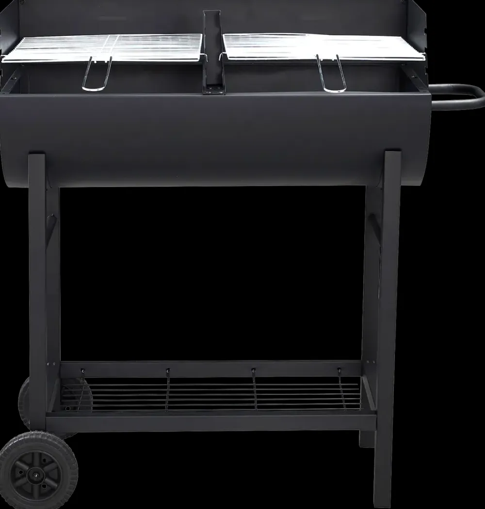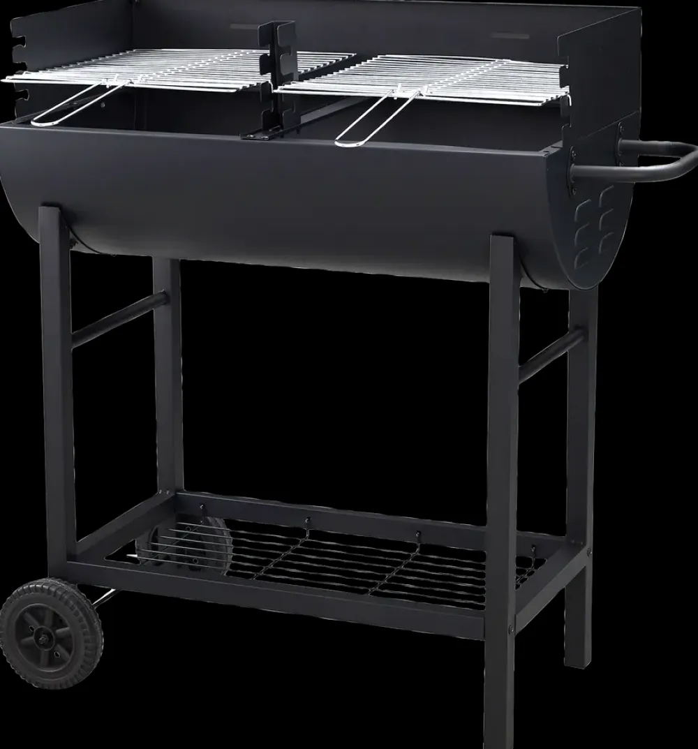 Størrelse: H. 91 x B. 90 x D. 46 cm.Tøndetykkelse: 0,8 mm.Materiale: pulverlakeret stål.Madlavningsareal: 39 x 34 cm x 2 stk.Madlavningsriste i krombelagt stål.Justerbar grillhøjde: 80-88 cm.Med hjul og håndtag for nem transport.Inkl. opbevaringshylde.