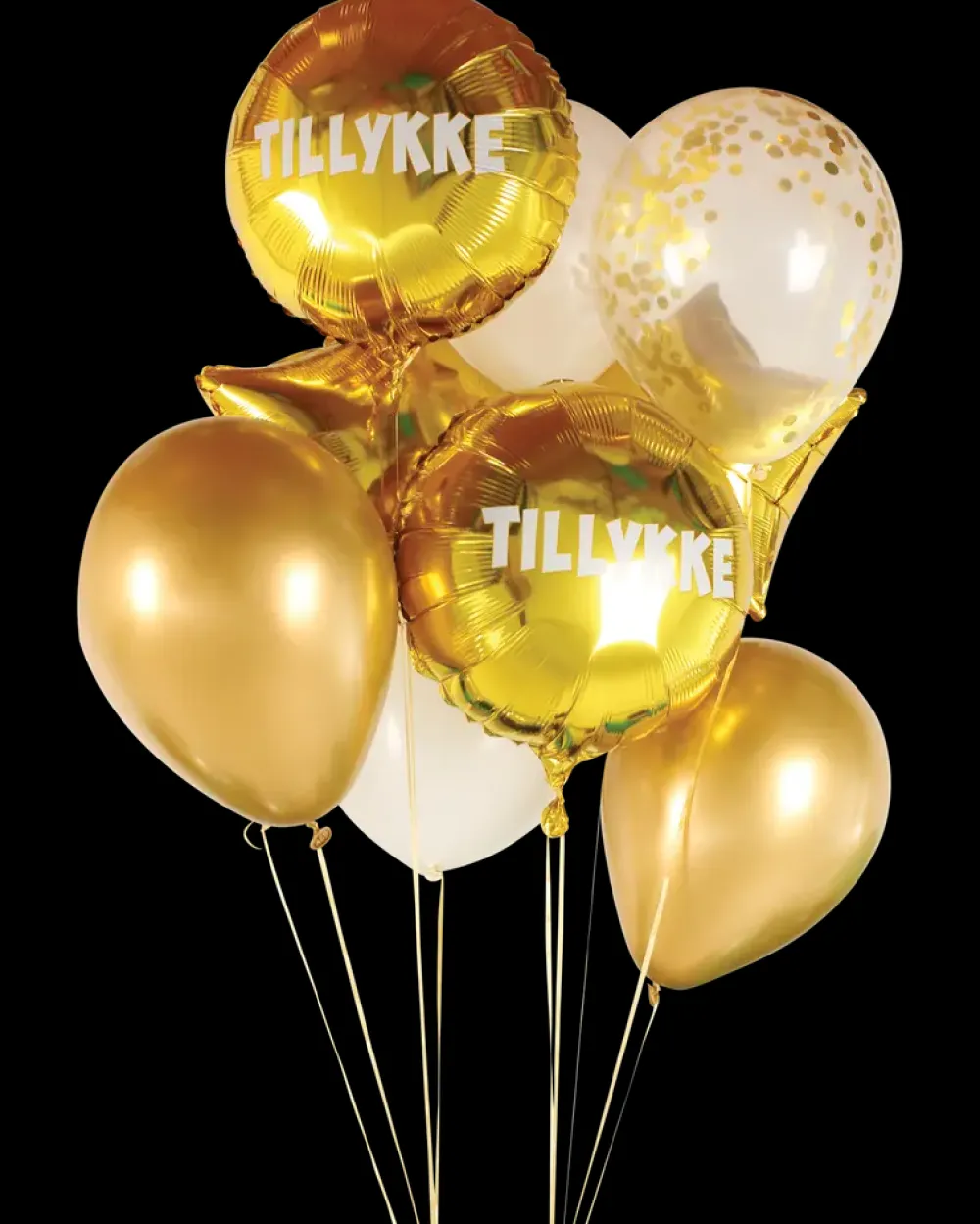 Ballonerne kan let pustes op med både luft og helium, hvilket giver dig mulighed for at skabe den perfekte dekoration til din fest.Puster du ballonerne op med helium vil de kunne svæve 4-6 timer.Ballonbuket i guld og hvid, indeholder:2 X Runde folieballoner med print “TILLKYKKE” Ø45 cm uden luft2 X Stjerne folieballon 45 cm uden luft 2 X Latex ballon, hvid 30 cm2 X Krom ballon, guld 30 cm2 X Konfettiballon, guld 30 cm