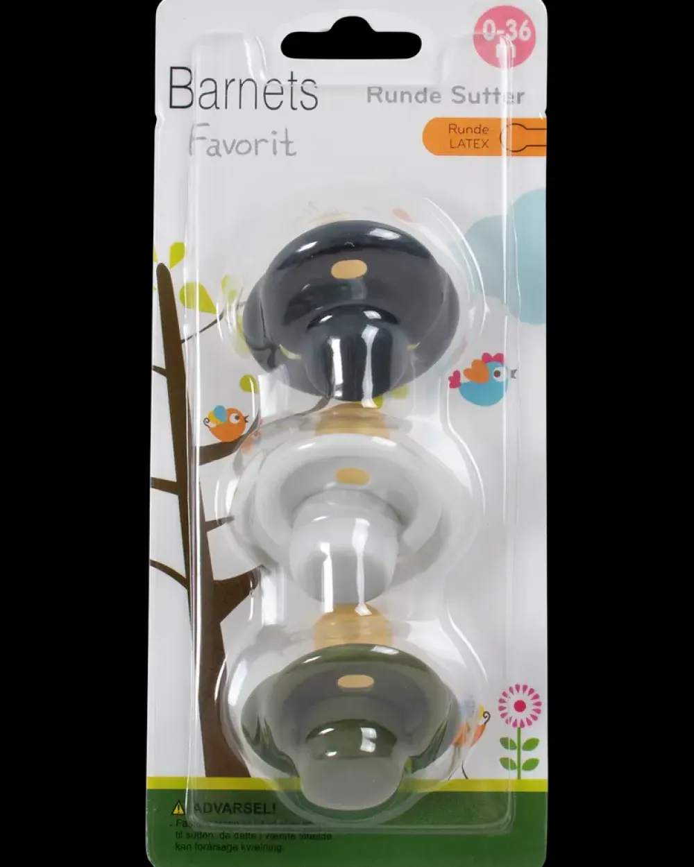 Barnets Favorit 0-36 mdr.Kommer i en pakke med 3 stk. assorterede sutter.Sutterne har en rund pasform, og suttedelen af latex er blød og fleksibel.Bemærk at der ikke vælges farve ved køb i webshop.