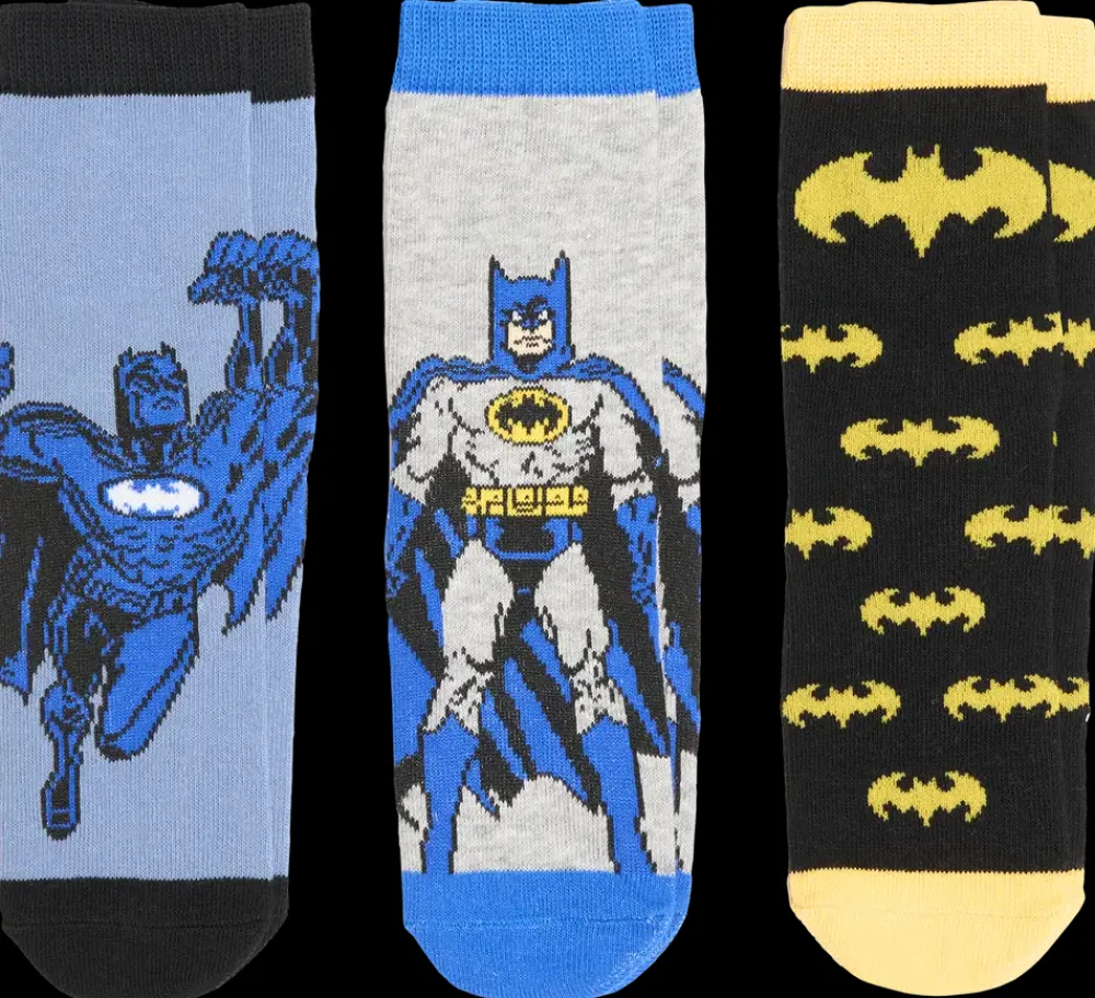 Disse Batman-børnestrømper er gode til små superheltefans. Pakken indeholder tre par strømper med forskellige Batman-designs i varierende farver. Strømperne er lavet af blødt og åndbart bomuldsmateriale, der sikrer komfort og en god pasform hele dagen. Velegnede til hverdagsbrug og som en sjov detalje til ethvert outfit.