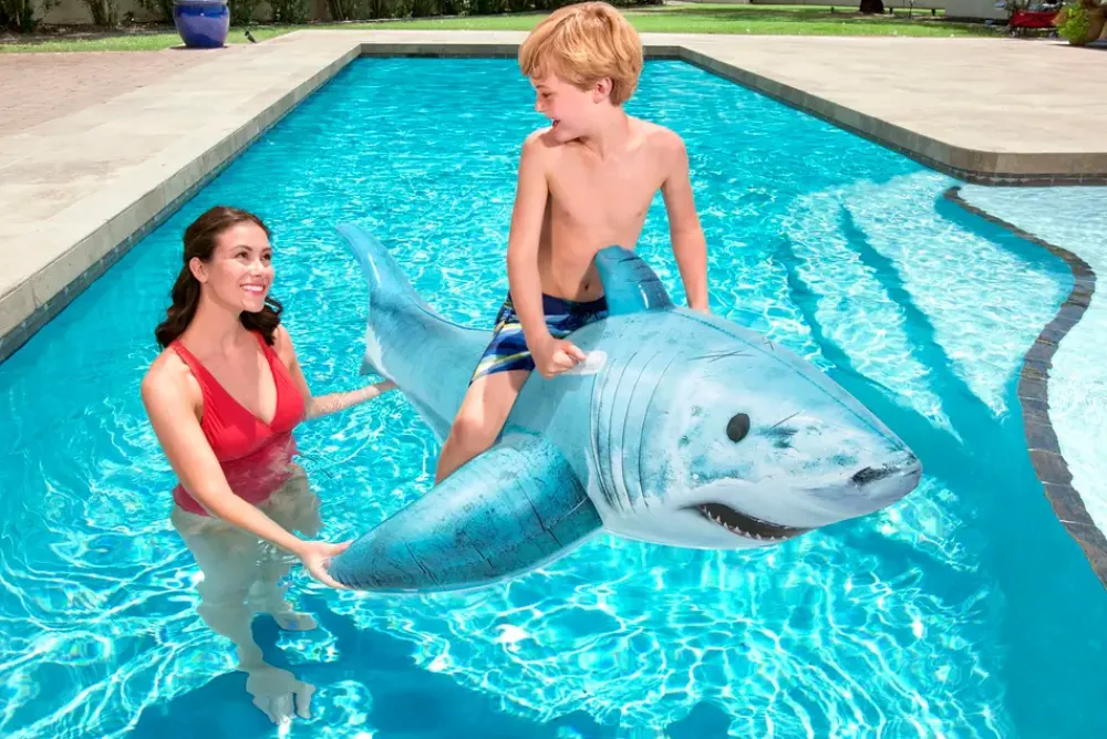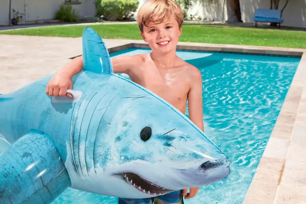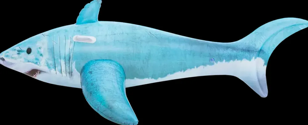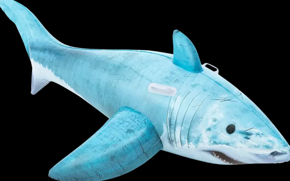 Denne oppustelige haj-flyder er skabt til sjov og leg på vandet. Med solide håndtag kan børn fra 3 år nemt holde fast og balancere under brug. Flyderen er velegnet til pool, strand eller sø og er let at puste op, tømme for luft og opbevare. Produktet er fremstillet i slidstærkt materiale, der sikrer langvarig brug og sjove stunder for hele familien.