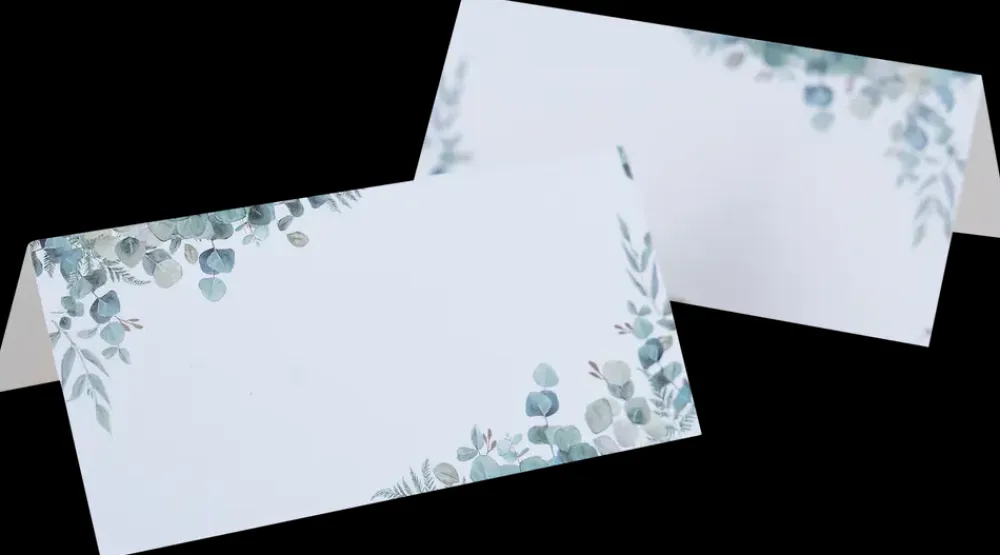 Bordkort i hvid med grønne eucalyptus blade. Pakke indeholder 10 bordkort.