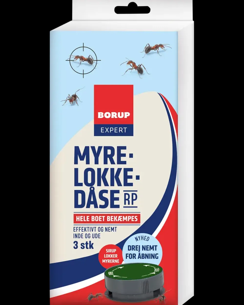 Borup Expert myrelokkedåse anvendes til bekæmpelse af myrer både indendørs og udendørs. Lokkedåsen indeholder en lokkende sirup, som myrerne optager og bringer med tilbage til boet, hvor virkningen fordeles og bidrager til bekæmpelse af hele myreboet. Løsningen er egnet til placering i hjemmet, på terrassen eller andre steder, hvor myrer forekommer.Dåsen er klar til brug og kræver ingen blanding eller forberedelse. Den diskrete udformning gør det muligt at placere den langs vægge, ved indgange eller i nærheden af myrernes færdselsveje. Produktet kan anvendes både inde og ude og er udviklet til at virke over længere tid.Sættet indeholder 3 lokkedåser. Dåserne er fremstillet i plast og har en grå farve. Åbningsfunktionen er udført, så dåsen er nem at håndtere ved placering.Farve: GråMateriale: PlastIndhold: 3 stk