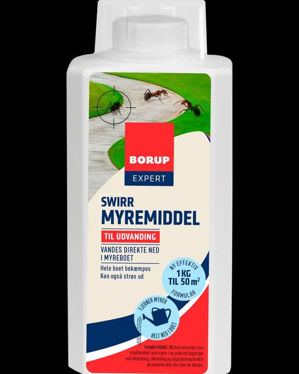 Borup EXPERT Swirr Myremiddel anvendes til bekæmpelse af myrer i og omkring bygninger. Midlet er beregnet til udvanding direkte i myreboet, hvor det fordeles i kolonien og bidrager til at bekæmpe hele boet. Det kan også strøs ud på de områder, hvor myrerne færdes.Produktet kan bruges flere steder udendørs, herunder ved terrasser, altaner, udhuse, bede, græsplæner og langs sokler. Ved korrekt anvendelse opnås en hurtig virkning samt kontrol over myrerne over længere tid, da midlet når ned i boet.Swirr Myremiddel leveres i en fast form, der gør dosering og udbringning enkel, afhængigt af om det anvendes tørt eller opblandet med vand. Én beholder rækker til behandling af op til 50 m².Tekniske oplysninger:Indhold: 1 kgFarve: HvidAnvendelse: Udlægning eller udvandingDækkeevne: Op til 50 m²
