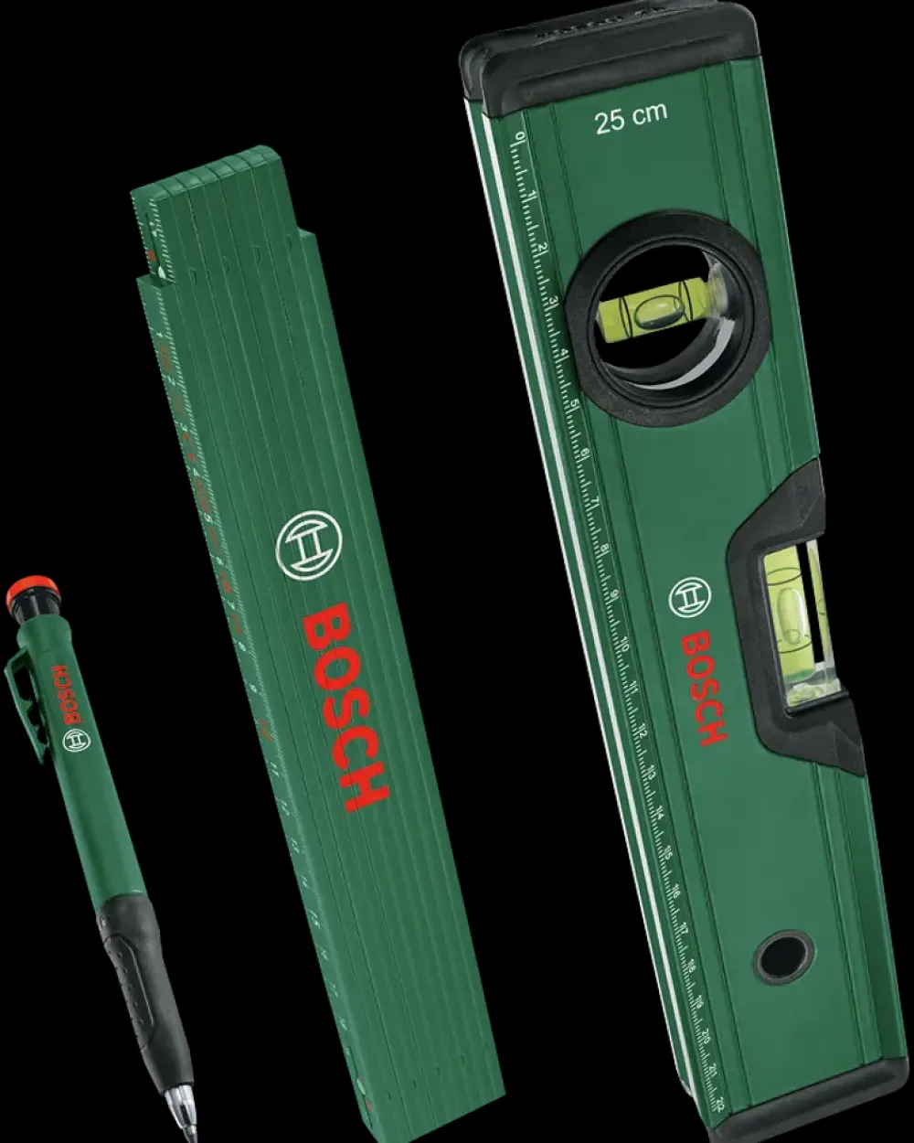 Opmærkningssæt med 2-meter foldelineal, 25 cm vaterpas og indtrækkelig blyant. Foldelinealen er lavet af glasfiberforstærket nylon for holdbarhed. Vaterpasset har en nøjagtighed på 0,05 mm/m og let aflæselige libeller. Blyanten har en aftagelig hætte, der fungerer som en 3,9 cm dybdemarkør.10 års garanti fra BoschBosch tilbyder en imponerende 10 års garanti på dette produkt. For at registrere din udvidede garanti, kan du finde vejledning under “Vejledninger og datablade”.