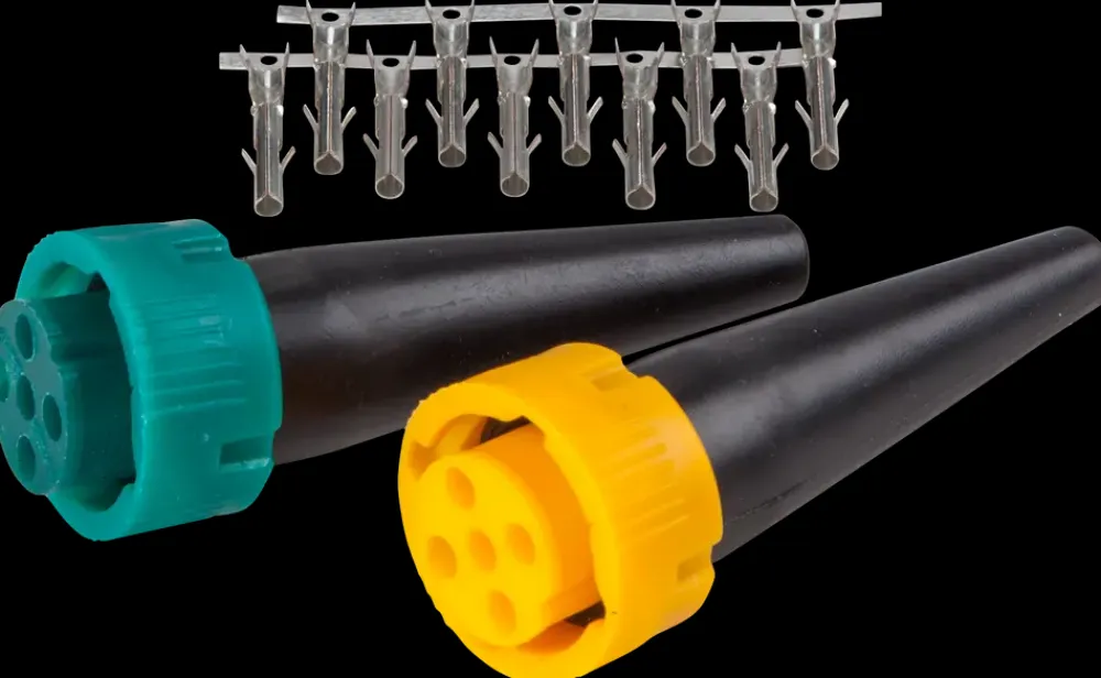 Stiksæt fra Branford® til trailerlygte. Komplet sæt med ét grønt og ét gult stik. Inkl. 10 stk. kontaktpin.