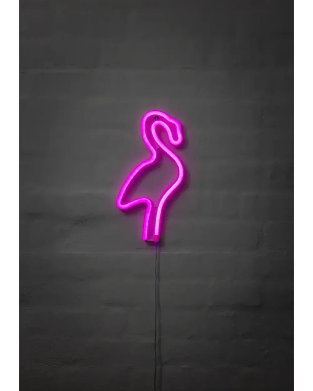 Dekorér hjemmet med dette fine lysskilt, som lyser op i mørket med sit lyserøde neon look, der fremhæver flamingoen.Lysskiltet kan hænges op på væggen.Væglampen er en fed og unik lampe, der både spreder god stemning i dit hjem i de sene aftentimer, og giver et godt og hyggeligt lys.Ledningen har en tænd/sluk knap.Bruges via en USB-port f.eks. på PC eller i en mobiloplader.